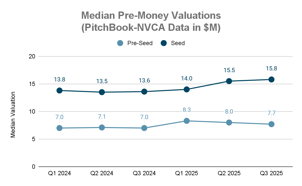 Pre-seed valuations are often around half the size of seed valuations, with the medians sitting at roughly $7.7M and $15.8M in Q3 2025. However, pre-seed valuations have been decreasing on average since the start of 2025, while seed valuations are seeing an upward trend.