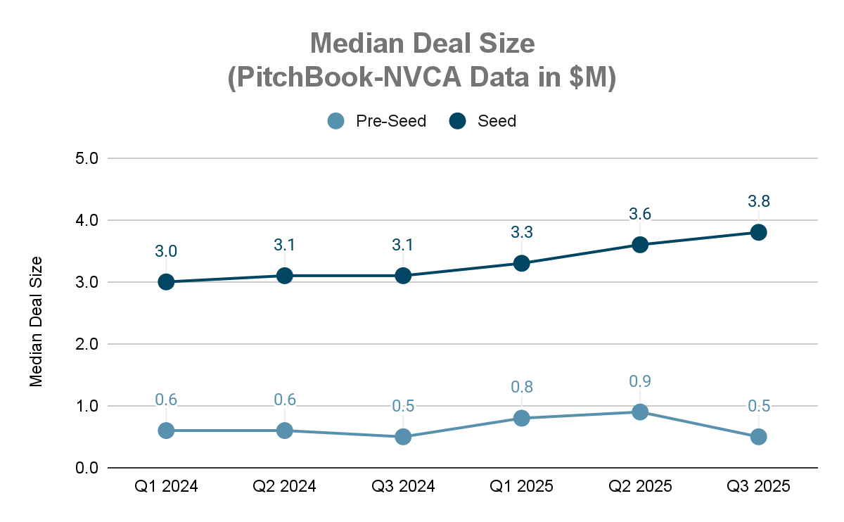 Seed rounds tend to be several times larger than pre-seed rounds, with the median deal size being $3.8M and $0.5M as of Q3 2025. Like with valuations, seed rounds are trending upward recently, while pre-seed rounds are down from the previous quarter and start of the year.