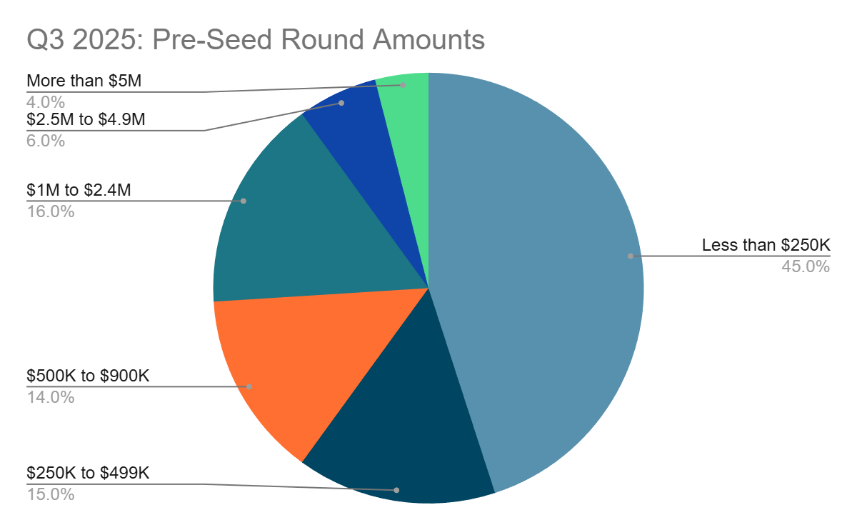 Notably, pre-seed fund amounts have been trending smaller on average since 2023. In Q3 2025, nearly half (45%) of rounds generated less than $250K, up from 39% in Q2 2025.