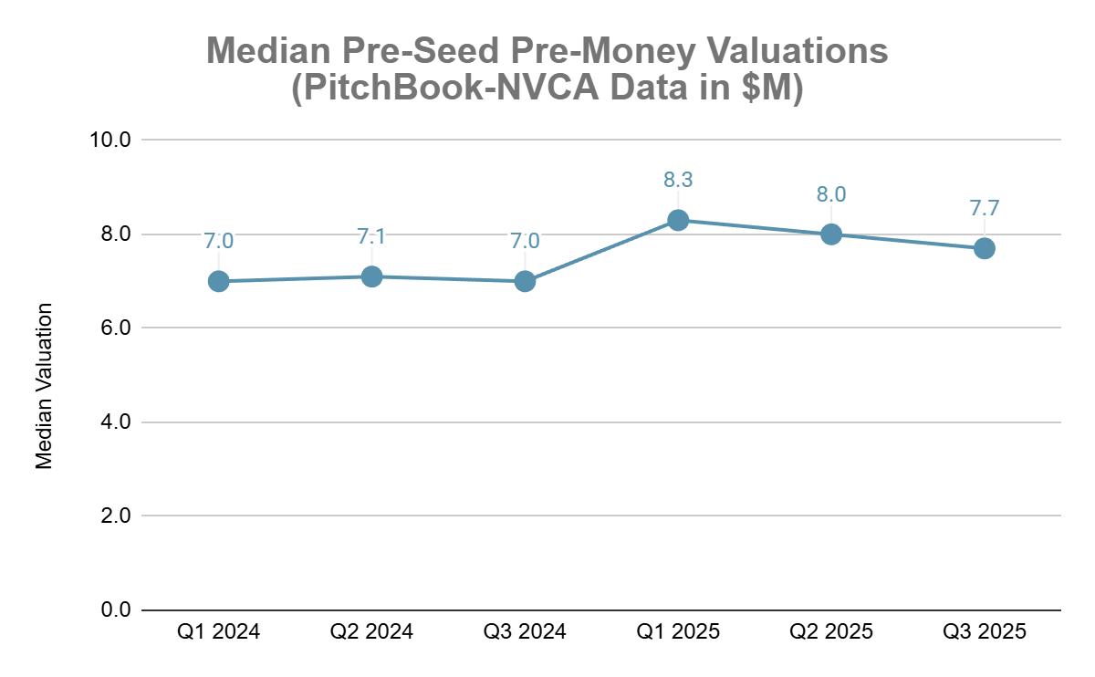 According to the most recent Pitchbook-NVCA Venture Monitor Report, the median pre-seed, pre-money valuation was $7.7M as of the end of Q3 2025, down slightly from $8.0M in Q2 2025.