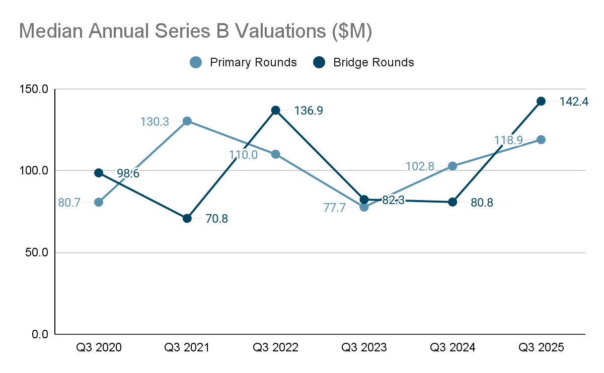 According to Carta’s most recent State of Private Markets report, the median pre-money Series B valuation was $118.9M for primary rounds and $142.4M for bridge rounds in Q3 2025.