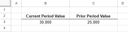 Let’s use the numbers from our last example to demonstrate. We’ll assume that you enter your current and previous year customer acquisition values in cells B3 and C3, respectively.