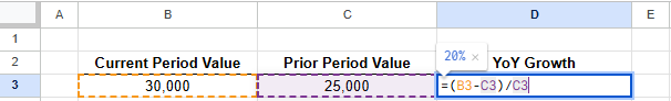 YoY growth = ((B3 – C3) / C3) = 20%