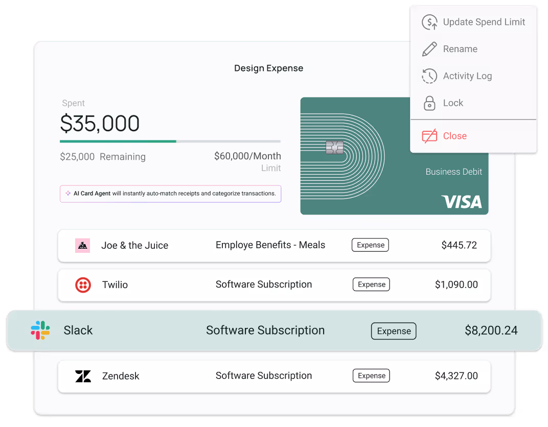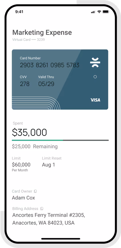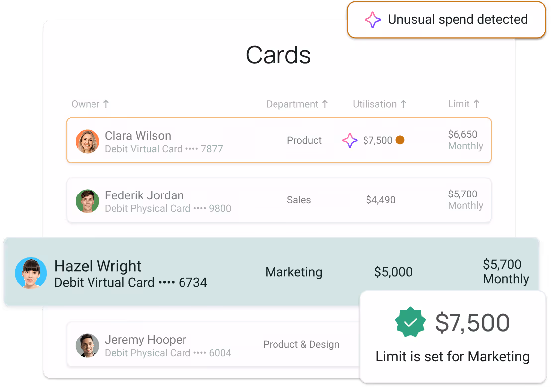 Set card limits by user, team, or project. Get AI-powered alerts when something looks off, so you stay in control without micromanaging.