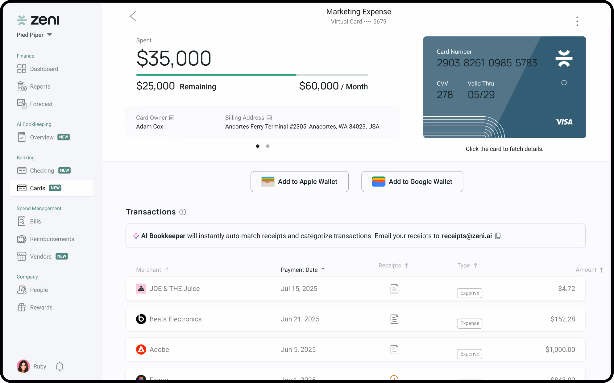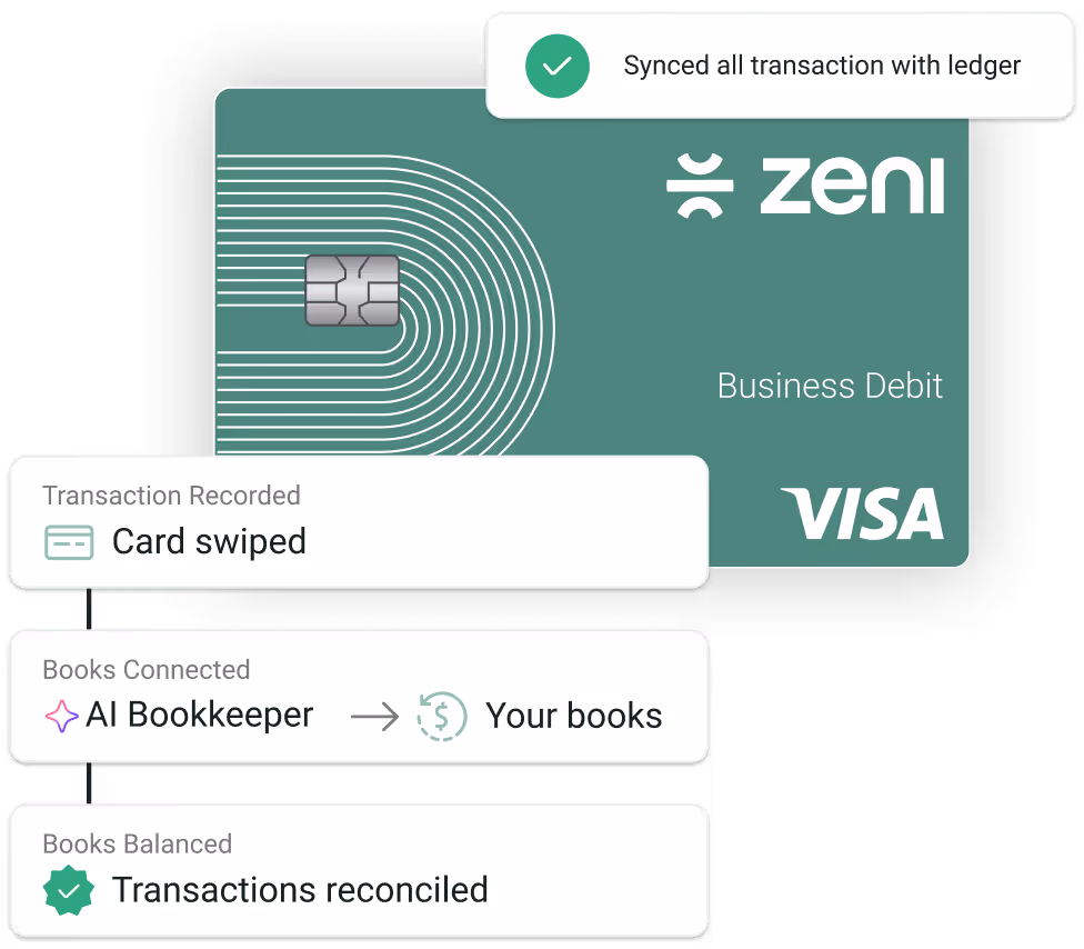 Each transaction is auto-categorized and reconciled with your books by Zeni’s AI Bookkeeper—receipts included.