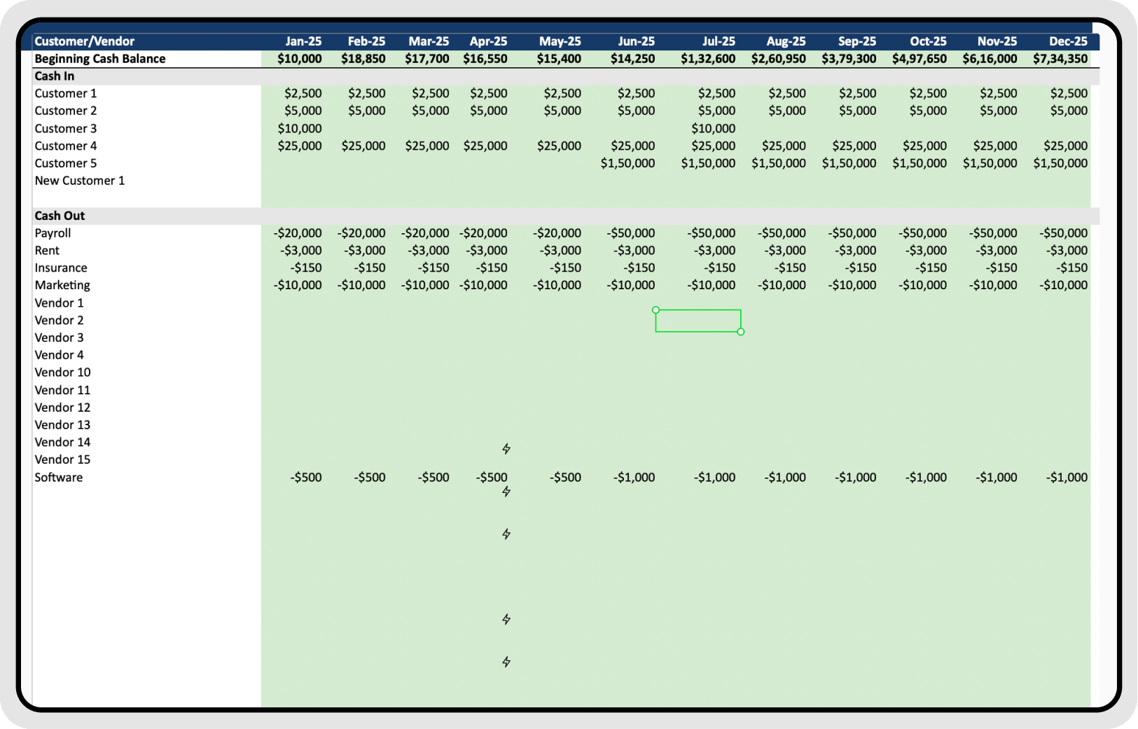 Unlike a P&L, which shows profitability, a cash flow model focuses purely on liquidity — what’s actually hitting (or leaving) your bank account.