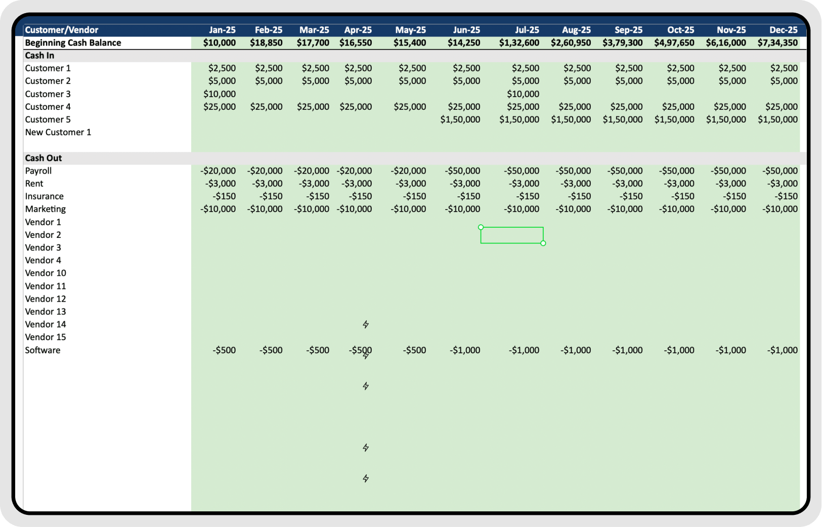 Our Monthly Cash Flow Model Template includes: